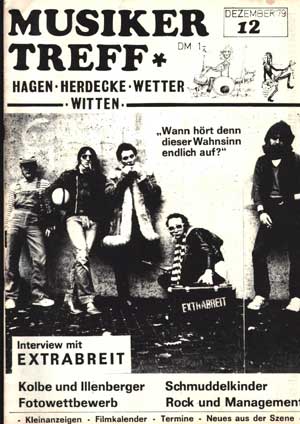 HORRIBLE HORN (23) alias Gerhard Sperling ist ein bleistiftdünner, jeden Rahmen sprengender Typ, der zuerst durch sein Outfit auffällt. Seine weisse Damenlederjacke und die Schiebermütze, unter der gewaltige Bartkoteletten hervorquellen, kombiniert er mit in Reggae-Farben gestreiften Hosen und den halbhohen Schnürschuhen seiner verstorbenen Grossmutter. Sein manisches und keinem chemischen Selbstexperiment abgeneigtes Temperament hat den ehemaligen Theologiestudenten, der aus einfachen, ländlichen Verhältnissen stammt, in die Rolle eines höchst unterhaltsamen Enfants Terribles hineinwachsen lassen, das die Ausstrahlung der frühen EXTRABREIT stark mitprägt. Sein damals unter LSD-Einfluss in die Nacht gebrülltes Bekenntnis "Ich habe mich einem Dämon verschrieben - und der heisst Leben!" könnte auch einer der Leitsätze über der kollektiven Biografie der Band sein. Wie Havaii macht er die nächtlichen Strassen Hagentowns als Mietwagenkutscher unsicher. Als KLEINKRIEG nach seiner Bundeswehrzeit mit ihm die Urzelle einer neuen Gitarrenband bildet, fällt dem in dieser Hinsicht ganz Unbeleckten die Rolle des Drummers zu. RALF CORLEONE (sein wahres Alter blieb stets im Dunkeln), wie der dunkelhaarige, schweigsame Typ am Bass von seinen Kollegen bald genannt wird, heisst eigentlich Ralf Teuwen und ist von einer etwas geheimnisvollen Aura umweht. Seine Herkunft ist unklar, es heisst, er sei im Heim aufgewachsen. Irgendwann in der Hagener Szene aufgetaucht, ist er auf Grund seines markanten Aussehens und seiner zurückhaltenden Art auch bei den Damen sehr beliebt. Bei den EXTRABREIT-Gigs steht er stets sonnenbebrillt und meist bewegungslos vor seinem Verstärker, seinen eigenen, eher sanften Bassläufen nachhängend, wobei nur hin und wieder ein mafioses Grinsen auf seinem Gesicht erscheint. Der fünfte Mann des Line-Ups ist PIET WORTMANN (28), der als einziger eine gewisse Erfahrung als Musiker hat. Der kleine Gitarrist, dessen Haupthaar sich schon in jungen Jahren gelichtet hat, hat schon in einer halbprofessionellen 70er-Rockband gespielt. Sensibel und hochmusikalisch trägt er einiges zur Festigung des Stils der Band bei, was sich auch in seiner Mitautorenschaft bei "Sturzflug" und "Es tickt" manifestiert. Noch ist nicht zu erkennen, dass er sich in einem quälenden inneren Konflikt befindet, der schon bald dazu führen wird, dass er unter dramatischen Umständen aus der Band ausscheidet. ![]() V.l.n.r.: Piet Wortmann, Ralf Teuwen, Kai Havaii, Horrible Horn, Stefan Kleinkrieg