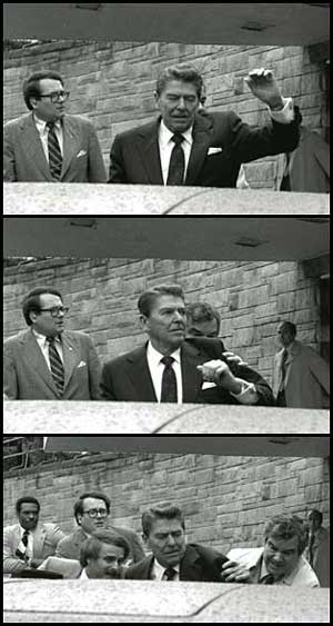 Es passiert an einem Montagabend. Kai kommt gerade von seinem zwischenzeitlichen Job als Layouter von "MUSIKER / MusicNews" nach Hause, einem Blatt, das der EXTRABREIT-Verleger Masuch mit seinem Partner Wiehagen betreibt und für das Kai auch schon ausführliche Interviews mit Django Edwards und Robert Smith von THE CURE geführt hat. Die Besatzung der B 56 hat sich in dem riesigen Wohnzimmer versammelt und starrt gebannt auf den TV-Schirm. Dort sieht man wieder und wieder und aus verschiedenen Kameraperspektiven, wie wenige Stunden zuvor der US-Präsident Ronald Reagan von den Kugeln eines Attentäters getroffen worden ist. "Diese Bilder hatten etwas ungeheuer Suggestives, die Nähe der Kamera zum Geschehen, das Verwackeln ein immer wieder zurückgespulter Moment, in dem die Welt den Atem anhielt. Dabei sah das gar nicht mal so brutal aus wie die Bilder vom Kennedy-Mord, aber es wirkte viel realer." (Kai Havaii) ![]() "Da sind die Schüsse Wir sehen wie er wankt und stürzt" Noch in derselben Nacht bringt Havaii den Text von "Der Präsident ist tot" zu Papier, indem er das Gesehene in eine eigene, symbolisch zugespitzte Bilderwelt transportiert. Denn abgesehen davon, daß Reagan dieses Attentat bekanntlich überlebte, kam er keineswegs aus der Kirche, auch die beiden Polizisten und die Kinder gab es nicht. Auf diese Weise kann das Attentat zum "Attentat schlechthin" werden und der "Präsident" zur allgemeingültigen Metapher des (westlichen) politischen Führers. Da die Band zu dieser Zeit praktisch ununterbrochen probt, stellt Havaii schon am nächsten Tag Stefan und den anderen die Idee vor. Im sogenannten "Eisenbahnerhäuschen", einer flachen kleinen Baracke am Ende der Sedanstraße gleich hinter dem Güterbahnhof hat man einen neuen Proberaum bezogen. Und hier entwickelt sich aus einem bedrohlichen, unheilverkündenden Groove und Kleinkriegs dramatischem Intro-Thema ein hypnotisches Stück, das längst legendär ist Bei der Albumsession im Mai wird die Nummer dann noch ein paar kleine, aber sehr expressive Zutaten erhalten... Tagsüber bewohnt man nun den Proberaum und am frühen Abend schaut man dann im Reggae-Büro hinter der "Sumpfblüte" vorbei, um die neuesten Entwicklungen mit Hoppe zu besprechen, der weiter manisch Gigs bucht. Zu vorgerückter Stunde aber hängt man seit Neuestem gern in einem Laden ab, der soeben von einer alten Freundin der B 56-WG eröffnet worden ist und der nicht nur der Hagener Szene für eine kurze, aber intensive Zeit zur neuen Heimat wird: Die "Neue Heimat"...