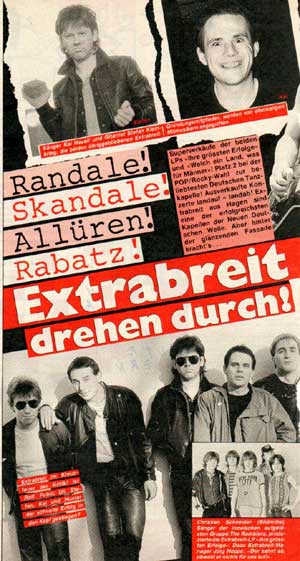 Man kann sagen, dass die Band diese Zeit in vollen Zügen genießt. Tagsüber gondelt man verschlafen im Tourbus über die Autobahn und hängt in Novotels ab, wo es die gigantischen "Ernie & Bert"-Eisbecher gibt, die bald in fortlaufenden Blöcken die Zimmerrechnungen dominieren und abends bringt man die Hallen zum Kochen. Die Nacht ist nicht allein zum Schlafen da im Gegenteil. Anlässlich "Hurra, hurra" ist nun auch die BRAVO voll auf Kurs gegangen und feiert EXTRABREIT als "die bösen Buben" der neuen Musikszene: "Wir ecken überall an" oder "EXTRABREIT bei jedem Konzert viel Polizei" das sind die Headlines in den Teenie-Magazinen. So kommt es während des Aufenthalts in Köln auch zu einem "klassischen" Rock n Roll-Vorfall. Aufgrund der natürlichen Sparsamkeit des Konzertveranstalters sind abgesehen von den Novotal-Bauklötzen auch hier und da eher minderwertige Hotels gebucht worden. Während DIE BREITEN das mit einer gewissen Selbstverständlichkeit hinnehmen, wächst bei anderen in der Musiker-Travel-Party der Unmut über solch unproportionale Knauserigkeit. In München wird es dann schließlich zu einer von SPLIFF angeführten Musikerrevolte kommen, mit dem Ergebnis, dass man im Park Hilton untergebracht wird, ein lauschiger und weltoffener Ort, an den unsre Helden in den nächsten Jahren noch oft zurückkehren werden. In ihrem kargen Kölner Hotel nun aber trägt sich bei einem gemütlichen Beisammensein der BREITEN, das zu vorgerückter Stunde in Stefans Zimmer stattfindet, Folgendes zu: Man ist harmlos ins Gespräch vertieft, als ohne weiteres Zutun plötzlich das Bett unter Rolf nachgibt und eine Seite des Möbels krachend zusammenbricht. Das ist das Signal zu verschärftem Vorgehen. Mit dem vom Verspeisen einer Batterie von Bockwürsten übrig gebliebenen Senf beginnt man die weiße Styropordecke mit wohlgesetzten Klecksern zu verzieren. Bald darauf fliegt ein Aschenbecher zur Decke und bleibt dort ohne weiteres stecken. Überall setzt nun emsige Tätigkeit ein. Stefan zeichnet auf der Tapete, während gleichzeitig der Sperrholzschrank fachgerecht zerlegt wird. Zwei Stühle und die Badezimmerarmaturen teilen sein Schicksal. Schließlich fällt der Blick der Destrukteure auf den Fernseher, der wichtig in der Ecke thront. Schon wird das Fenster aufgerissen und der schwere, schon etwas betagte Kasten auf den Fensterrahmen gehievt, wo er eine Weile balanciert, bevor man ihm unter Hochrufen den entscheidenden Stoß versetzt. Mit einem infernalischen Geräusch zerschellt das Gerät vier Stockwerke tiefer im Hof. Als Stefan am nächsten Morgen inmitten der Trümmer seiner Stube erwacht, schwant ihm, dass diese Nacht nicht folgenlos bleiben wird. Zwar versucht JAH auf die Frage des kreidebleichen Rezeptionisten nach "einem Herrn Klein" mit der Auskunft "Der gehört nicht zu uns" eine falsche Fährte zu legen, aber schon bei der Ankunft in der nächsten Stadt präsentiert MAMA CONCERTS die Rechnung: 10.000 Deutschmark. Da trifft es sich gut, dass die BRAVO EXTRABREIT, das erste Mal auf dem Titel hat. Welch schöne Blüten das Bad-Boy-Image treibt, sieht man an diesem Artikel aus der Zeitschrift POPROCKY: ![]()