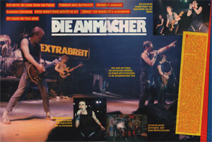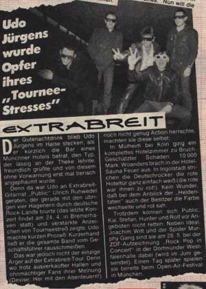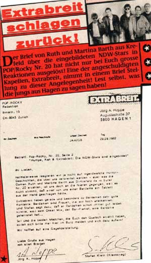 Kaum hat der "Hotelzimmer-Raid" von Köln auch pressemäßig ein gebührendes Echo gefunden (s.u.), da erschüttert im September 1982 der "Bardamen-Skandal" die Teenie-Presse: Zwei POPROCKY-Leserinnen aus Krefeld haben "die NDW-Stars" als arrogant gebrandmarkt und im Falle von EXTRABREIT von einer Begegnung in einem Münchner Nachtlokal berichtet, bei der sie Augenzeugen des krassesten Vandalismus geworden sein wollen: in heimtückischer Weise habe man einer Bardame glatt das vollgetürmte Tablett aus der Hand geschlagen! Diese infame Beschuldigung kann nicht unwidersprochen bleben: Schon in der folgenden Ausgabe druckt das Blatt ein Statement der Band, in dem die Vorwürfe zurückgewiesen werden und in dem es u.a. heißt: "Extrabreit haben gerade und besonders zu Bardamen sehr gute Kontakte. Bardamen sind Frauen, die wir hoch anerkennen und Stefan sagt dazu, daß er Bardamen schon immer gut leiden konnte, weil sein Onkel Mix, der Barpianist, eine Bardame* geheiratet hat" *die Rede ist hier von Kleinkriegs Tante Bertel, die bis ins hohe Alter EB-Konzerte im norddeutschen Raum durch ihre extravagante Erscheinung bereicherte (K.G) ![]() Alles Lüge! So sind wir gar nicht! Aber es sind am Ende nicht nur solche Petitessen, die das "Bad-Boy-Image" der Band prägen, manchen erscheinen gerade die Konzerte als die Brutstätten der Revolte: "Das sieht die Polizei mit gemischten Gefühlen: Kai Hawaii gibt Kommandos an die aufgepeitschten Fans...keine andere Band putscht so auf...Publikum wird durchsucht...wirkt wie ein Rockteufel: Kai Hawaii"...das klingt natürlich nach mehr... ![]() Solchermaßen positioniert kann es die Band auch nicht überraschen, dass einige aufgebrachte Eltern Briefe an das Kultusministerium schreiben und solche Protestnoten auch als Kopien dem EB-Büro zukommen zu lassen: Tenor: Da bemüht man sich, seine Kinder im Sinne der freiheitlich-demokratischen Grundordnung...und dann das: Aufforderung zur Brandstiftung an Schulen! Überraschend allerdings tatsächlich die Aktion einer 15jährigen Lübeckerin, die während der Ferienzeit versucht, an ihrer (leerstehenden) Schule Feuer zu legen die schreckliche Vision des Schulbeginns vor Augen. Tatsächlich stellt sich heraus, dass sie die beiden EXTRABREIT-Alben im Schrank stehen hat. Dies bleibt ein Einzelfall, aber klar ist, dass sich all dies zusammengenommen in einer breiteren Öffentlichkeit zu einem Bild verdichtet, das den BREITEN die Rolle der Rockn Roll-Monster zuteilt. ![]()