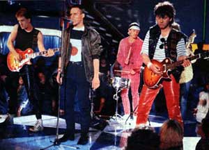 "JAH und ich waren kaum noch da und wenn, ging wegen EB den ganzen Tag das Telefon. Oder es standen Fans oder die BRAVO vor der Tür. Die anderen reagierten verständlicherweise zunehmend genervt, das Gleichgewicht war gestört. Es endete mit dem Auseinanderbrechen derr Gruppe. Jörg und ich zogen in eine gemeinsame Wohnung und auch die anderen zerstreuten sich später. Das war traurig, aber es war wohl nur eine Frage der Zeit, bis jeder von uns zu neuen Ufern musste. Für mich war die B 56 eine ungeheuer wichtige Sache, die mir den entscheidenden Anstoß gab." (Kai Havaii) Aber auch bei den anderen BREITEN gibt es Veränderungen. Stefan hat eine winzige Souterrain-Wohnung in Hagen-Emst bezogen, die allerdings praktisch rund um die UIhr von Fans belagert wird. Public lässt sich gerade ein Appartment renovieren und logiert für einige Wochen im "Queens"-Hotel (heute "Mercure") direkt bei der Hagener Stadthalle, jenem "Glaspalast", der EXTRABREIT noch mehr als 20 Jahre verschlossen bleiben wird, bevor man hier am 20. Dezember 2003 eine triumphale "Heimkehr" feiert. Rolf Möller bereitet sich mit Freundin auf den Umzug in ein Einfamilienhaus mit Garten vor (wo er wenig später auch ein Kellerstudio einrichten wird). Hunter schließlich lebt schon seit einigen Jahren mit Freundin Heike "Auf der Gethe" in Sprockhövel vor den Toren Hagens. Dieser alte Bauernhof mit angeschlossenen Stallungen und einem Proberaum in der Scheune (der in der kommenden Zeit auch für EB-Proben genutzt werden wird) ist ein wahrhaft idyllisches Fleckchen mit kleinem Teich im Hof, einem großen Garten und Feldern und Wiesen ringsum. Ein Ort der Harmonie, nicht nur zwischen Mensch und Tier, sollte man meinen. Dieser Eindruck wird höchstens durch die Tatsache relativiert, dass der Vorpächter hier im Zustand geistiger Umnachtung seiner Frau und zwei Töchtern mit einer Schrotflinte das Lebenslicht ausgeblasen hat. Hunters ganz dem Leben zugewandte, praktische Art hat sich auch hier wieder gezeigt: Nachdem er sich spontan entschlossen hat, das Anwesen zu mieten, hat sich der Pragmatiker sogleich daran gemacht, die verbliebenen Blutflecken auf Tapeten und Fußböden zu beseitigen. Die "Gethe" wird auch in kommenden Jahren ein häufig frequentierter Treffpunkt der BREITEN bleiben, ob bei entspannten Meetings im Garten, beim Proben oder auch bei Demoaufnahmen. Wie man an dem einen oder anderen Detail erkennt, ist für unsere Helden nun schlagartig auch die Zeit der Armut vorbei. Inzwischen sind mit der üblichen abrechnungstechnischen Verzögerung erhebliche Summen an Plattenlizenzen und GEMA-Ausschüttungen auf das Bandkonto und von dort auch weiter auf die Privatkonten der BREITEN geflossen. Außerdem läuft der Vertrag mit METRONOME zu einem sehr günstigen Zeitpunkt aus: Gerade jetzt ist EXTRABREIT ganz oben und so dürften die anstehenden Neuverhandlungen mit METRONOME im Sinne der Band zu gestalten sein. JAH hat die Zeichen der Zeit erkannt und regt an, bei den Gesprächen einen Partner hinzuzuziehen, der zwar nicht gerade billig, dafür aber für eine knallharte Verhandlungsführung bekannt ist: den Münchner Rechtsanwalt Dr. Axel-Meyer-Wölden, dessen Name bei den Plattenbossen bereits einen furchterregenden Klang hat und der in späteren Jahren u.a. als Berater von "Wimbledon-Bobele" Becker von sich reden machen wird. Als man sich anlässlich eines Playback-Auftritts in der ZDF-Sendung "Desirees Musikbox" in München aufhält, wird für den darauf folgenden Tag ein Termin in Mayer-Wöldens Büro vereinbart... ![]() EXTRABREIT in "Desirees Musikbox" (Hunter ist nicht im Bild)