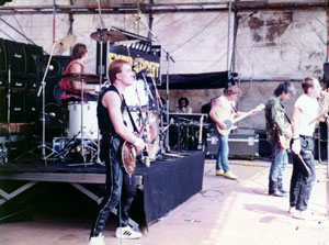 Die Lösung findet sich in Reinhold Mack, einem deutschen Producer, der im berühmten Musicland-Studio in München wirkt. Mack wie er sich ausschließlich nennen lässt, weil er mit seinem Vornamen auf Kriegsfuß steht, ist ein feinsinniger, etwas introvierter Schwabe, der äußerlich ein wenig an John Lennon erinnert. Früher Gitarrist, ist er in den 70ern Ton-Assistent von Giorgio Moroder geworden, dem Erfinder des Electronic-Dance-Pop, dem er mit Donna Summer zum Durchbruch verholfen hatte. Mack hat sich längst von seinem Lehrmeister emanzipiert, erst recht, nachdem er für Queen 1979 den No. 1-Hit Crazy Little Thing Called Love gemischt hat. Seitdem gilt er nicht nur Freddie Mercury als genius, auch die Rolling Stones oder Electric Light Orchestra haben seine Dienste schon in Anspruch genommen. Kurz: Mack ist weltweit einer der gefragtesten Procucer. ![]() Queen mit Producer Mack (oben rechts) Als JAH Kontakt mit ihm aufnimmt, zeigt sich der Charts-Wizard nicht nur freundlich interessiert, es stellt sich auch heraus, dass tatsächlich ein kleines Zeitfenster von etwa 8 Tagen existiert, in dem der Meister sich dem Remix der Rückkehr der phantastischen5! widmen könnte. Nachdem man sich auf ein angemessenes Salär und eine Lizenzbeteiligung schnell geeinigt hat, geht der hagere Mann mit der Nickelbrille ans Werk: Er betrachtet es als reizvolle Aufgabe, erstmals daheim in der ganz neu erstarkten deutschen Musikszene mitzumischen. Auf dem riesigen Pult des Musicland-Studios entsteht nun ein Klangbild, das die Rückkehr tatsächlich auch soundtechnisch zu einem State Of The Art Album macht. Hochzufrieden wird das Ergebnis von den BREITEN entgegen genommen. Zu diesem Anlass ist man nach München gereist, um neben weiteren Terminen ein wenig im Park Hilton den Sommer zu genießen und sich abends von lokalen Promotern ins Why Not oder ins Shugarshack schleppen zu lassen, wo neben der Münchener High Society auch Abi Ofarim, der zeitgleich in München ein Album produziert, starräugig am Tresen klebt. Zwischendurch verschwindet er im 10-Minuten-Takt im Toilettentrakt. Als der Troubadour gerade wieder seinen Barhocker verlassen hat, schnappt der in der Nähe stehende Kleinkrieg, ein Gespräch zwischen zwei Mitgliedern seiner Entourage auf: Reine Koksproduktion. Abi hört nichts mehr... Ein paar Jahre später werden sich die BREITEN und der israelische Schmecklecker während der Aufzeichnungen einer TV-Show noch einmal begegnen: Abi porträtiert darin in einer dramatischen Ballade eben jene Zeit: Much Too Much... Nun sind, wie erwähnt, auch die BREITEN in dieser Zeit nicht unbedingt Kostverächter, in die anfängliche Euphorie mischt sich aber nun mehr und mehr auch ein gewisser Ekel vor der routinemäßigen Exzessivität mancher Showbusiness-Gestalten: Im Shugarshack traf ich damals einen bekannten deutschen Tour-Veranstalter, der buchstäblich aus dem Hals nach Kokain stank, oder besser: es mischten sich die rein chemischen Gerüche mit den biologischen... (Kai Havaii). Wie sehr die BREITEN aber trotz der nun erreichten Bekanntheit und der häufigeren Begegnung mit der Haute Volee und ihren luxuriösen Revieren immer noch dem eher proletarischen Charme ihrer Heimat und Herkunft verhaftet sind, mag folgende Episode illustrieren: Bei einem der ersten Aufenthalte im Park Hilton beschließt man, neben der häufig frequentierten Bar nun auch einmal das als vorzüglich gerühmte Restaurant des Hauses zu besuchen. Nachdem man Platz genommen hat, fällt Publics begehrlicher Blick auf das gigantische Roastbeef, das neben anderen Köstlichkeiten am Buffet auf der gegenüber liegenden Seite aufgebaut ist und von dem sich soeben ein elegant gekleideter Herr bedient. Der EXTRABREIT-Gitarrist begibt sich mit seinem typischen wiegenden Gang schnurstracks zum Buffet, um sich von dem edlen Fleisch zu holen. Plötzlich wird die Unterhaltung im Saal durch lauten Streit unterbrochen. Die Köpfe der BREITEN und der anderen Anwesenden drehen sich in Richtung Buffet, wo sich folgende Szene bietet: Public hat den riesigen Braten mit dem daneben liegenden Messer traktiert und eine Scheibe in etwa so dick wie der Quelle-Katalog bereits zur Hälfte abgesäbelt. An seinen Messerarm klammert sich der befrackte Maitre des Buffets, der sozusagen hauptberuflich für das Tranchieren und Servieren des Bratens zuständig ist und stößt immer wieder hervor: Mein Herr, entschuldigen Sie, mit Verlaub, das ist meine Auf... Der wutschnaubende Public lässt sich nicht beirren: Du hast gerade schon ne Scheibe genommen, das habe ich klar gesehen. Lass sofort meinen Arm los, Du Spinner! Ist ja genug da! Nicht zu fassen, der Typ! Bei all diesem Savoir Vivre bleibt man aber auch live nicht faul, wie verschiedene Open Airs kleinere und größere belegen. ![]() Mai 1982: Open Air im Reitstadion München-Riem (u.a. mit ZZ Top). V.l.n.r.: Möller, Public, Hunter, Kleinkrieg, Havaii ![]()