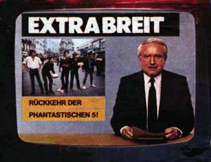 Nach der Rückkehr von diesem Wien-Trip, der wie gewohnt auch für interessante amouröse Verwicklungen gesorgt hat, begeht man zunächst Stefans 27. Geburtstag bei einer rauschenden Party in dem Bungalow, den Kleinkrieg erst kürzlich mit seiner Lebensgefährtin gemietet hat. Auch Havaiis neueste Flamme, ein Münchner Fotomodell, das der Frontmann im U4 in Wien kennengelernt hat, ist mit von der Partie. Silvester wird schließlich auf Hunters Landwohnsitz zelebriert. Auf mehreren Etagen des kommoden Anwesens tummeln sich illustre Gäste von nah und fern. Auch Michael Oplesch, EXTRABREITS neuer Metronome-Ansprechpartner, ist in seinem roten Camaro angereist und steht etwas verschüchtert mit seinem Glas in einer Ecke*. Fünf Tage später beginnen in der Parkhalle in Iserlohn unweit von Hagentown die Proben zur Rückkehr der phantastischen 5!-Tour, die EXTRABREIT bei insgesamt 33 Konzerten in die größten Hallen Westdeutschlands sowie Wien und Zürich führen soll. Mit nie dagewesenem Aufwand will sich die Band nun inszenieren: Zum ersten Mal sollen auf deutschen Konzertbühnen zwei große Video-Leinwände zum Einsatz kommen. Dort werden die neuen Songs in Film-Collagen kommentiert und illustriert, ein besonders ausgeklügeltes Lichtsystem ermöglicht die störungsfreie Projektion. Kleinkrieg gibt mit seiner Gitarre bei Superhelden Feuerstöße auf Godzilla ab, der riesenhaft über ihm auf der Leinwand auftaucht. Ferner gibt es zwei Catwalks, Laufstege, die links und rechts von der Bühne aus ein Stück ins Publikum reichen. Zwei Live-Kameras liefern nicht nur Großaufnahmen der Musiker beim Konzert, sondern zeigen auch ihren Weg von der Garderobe zur Bühne sowie Backstage-Bilder nach der Show. Als besonderer Gag wird der jedem bundesdeutschen Haushalt bekannte Tagesschau-Sprecher Werner Veigel engagiert, um jede einzelne Show von der Leinwand herab anzukündigen: ...wurde soeben bekannt, dass die Phantastischen 5 in Essen gelandet sind... Zu all dem gibt es auch noch einen Saxophonisten namens Appel, ein sensibler Junge aus dem Ruhrgebiet, den man erst beim Proben kennen gelernt hat und der mit seinem virtuosen Spiel die Songs Duo Infernal und Komm nach Hagen veredeln soll. Der Gute hat noch nie in seinem Leben vor so extatischen Zuschauermassen und auf solchen Bühnen gestanden und ist dementsprechend nervös und überwältigt, was in den ersten Tour-Tagen auch öfters Anlass für Flachsereien ist. Dann lässt der zerstreute Jungmusiker einen geöffneten Brief seiner Freundin auf dem Frühstückstisch liegen. Seine Mitfrühstücker können nicht widerstehen und werfen ein Blick in das Schreiben: Der erste Satz lautete: ...kann ich mir gut vorstellen, wie schrecklich es für Dich sein muss, mit solchen Leuten auf Tour zu sein... Das gab natürlich brüllendes Gelächter, aber wir hatten auch ein schlechtes Gewissen, weil wir ihn vielleicht einmal zu oft auf die Schippe genommen hatten. Er war eben wirklich empfindlich und nachdem uns das nun klar geworden war, benahmen wir uns besser. Appel blühte dann im Laufe der Tour immer mehr auf. (Kai Havaii) ![]() Auch das Motiv des Tourplakats: Werner Veigel kündigt die Breiten an Bei ihrem Outfit hat sich die Band von dem Comic-Poster (siehe Folge 55) inspirieren lassen, das dem Album beiliegt. Kai z.B. hat sich für sein Superhelden-Alter Ego ein Kostüm mit Frage- und Ausrufezeichen gewünscht. Diese Zeichen tauchen nun auch auf seinem Bühnenshirt auf. Wie gewohnt, wird dieses Szenario vom Feuilleton eher mit Unverständnis quittiert. Der Schreiber der Süddeutschen Zeitung entdeckt gar faschistoide Züge. Dass in einem der Video-Sequenzen für Sekunden das Porträt Adolf Hitlers erscheint, ist ihm nicht entgangen und wird in seinem langen Artikel auch erwähnt, zusammen mit dem jungen, schlanken Sänger, der in seiner SS-artigen Uniformmütze als Einpeitscher agiert. Dass Hitler in der Video-Collage zu Superhelden neben Stalin, Mao Tse Tung , Micky Maus, King Kong und anderen Helden und Monstern zu sehen war, schreibt er nicht und rückt die Band so ins Zwielicht rechter Gesinnungen. Solche Absurditäten können aber weder Band und Publikum noch den weniger ignoranten Journalisten den Spaß an der Sache verderben. Unter der Headline Extrabreits wilde Energie erscheint nach dem Ende der Tour in einem Musikmagazin ein langer Artikel, der so schön blumig geschrieben ist, dass hier ausnahmsweise einmal eine längere Passage zitiert werden soll: Alle Videotricks, so teuer und ausgetüftelt sie auch gewesen sein mögen, sind aber nur Zierrat, auf den die Hagener zur Not auch verzichten könnten. Denn ihr Konzert ist wirklich atemberaubend. Nicht , weil man sich über die notengetreue Wiedergabe liebgewonnener Extrabreit-Heuler freuen kann, sondern wegen der wilden, aggressiven Energie, die die Truppe verstrahlt. Wenn man dem ganz im schwarzen Django- (Sein Gebetbuch ist der Colt) Look gekleideten Kleinkrieg zuschaut, wie er mit wütenden, aber hundertstelsekundengenauen Schlägen auf seine Gibson-Gold-Top eindrischt, die er bei solcher Beanspruchung nach so gut wie jeder Nummer neu stimmen lassen muss, läufts einem schon kalt den Rücken runter. Aber nur noch sich selbst, Frau und Kinder in Sicherheit bringen will man, wenn er dann mit düsterem Bartansatz und finsterer Miene im Gesicht mit ein paar schnellen Schritten seinen Laufsteg entlang nach vorn, mitten in die brodelnde Menge, gesteppt kommt, als wolle er den schreienden Fans vorne an der Rampe seinen Cowboy-Stiefel ins Gesicht stecken. Gut, daß Front-Mann Kai, der über die Kondition eines Marathon-Läufers verfügen muss, mit fröhlichem Spruch und seinen Rekord-Sprints auf der Stelle für lockernden Ausgleich sorgt! Die Leute müssten sonst die nach siebzigminütigem superschnellen Extrabreit-Dauerfeuer angestaute Stoßenergie, wie in alten Stones- oder Who-Zeiten, am Konzertsaal-Mobiliar austoben. Keine Frage: Dies ist sicherlich die beste EXTRABREIT-Show aller Zeiten, dennoch gi